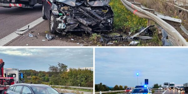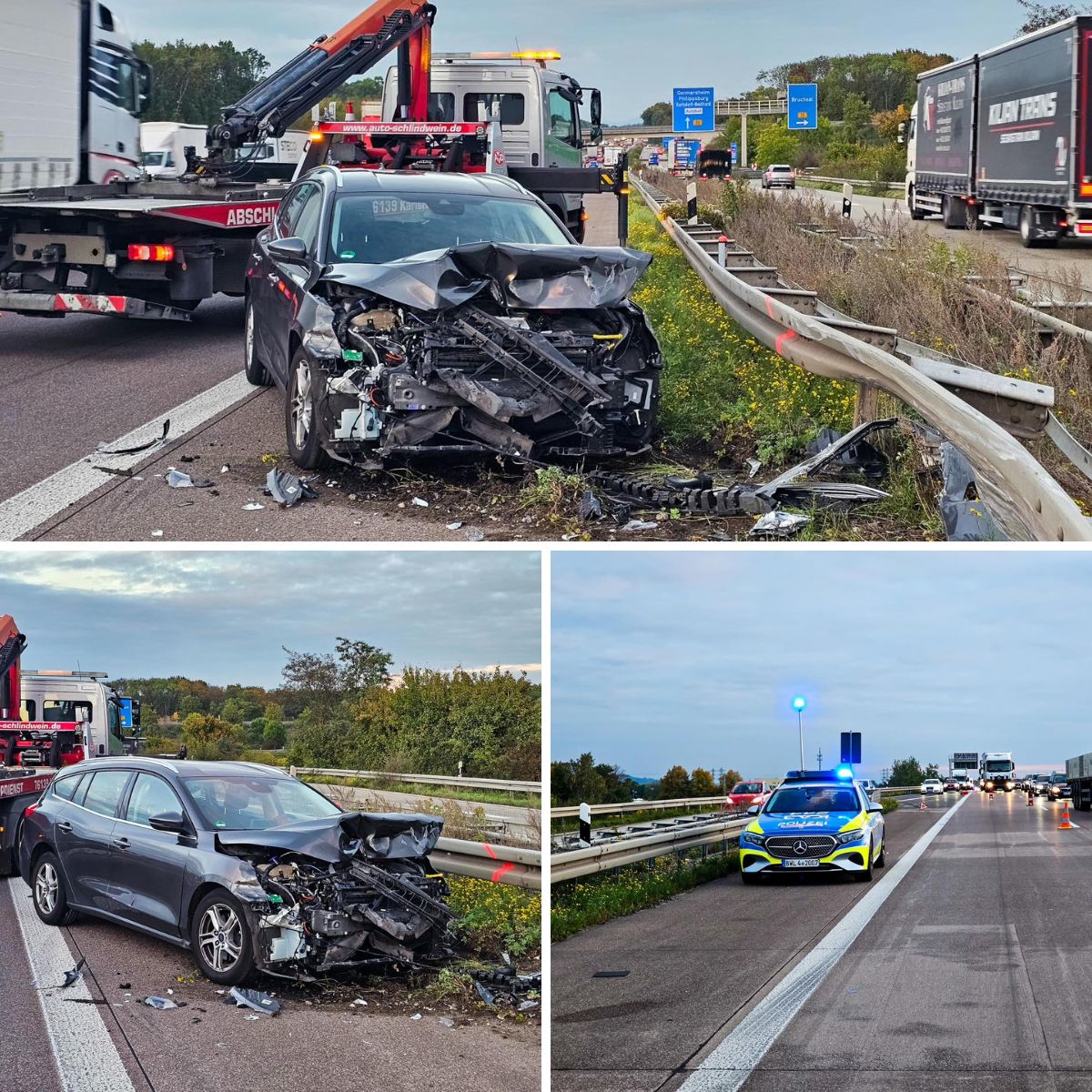 Nach Karambolage auf A5 bei Bruchsal in Leitplanken geschleudert: Auto kollidiert mit Lastwagen und wird in Leitplanken geschleudert