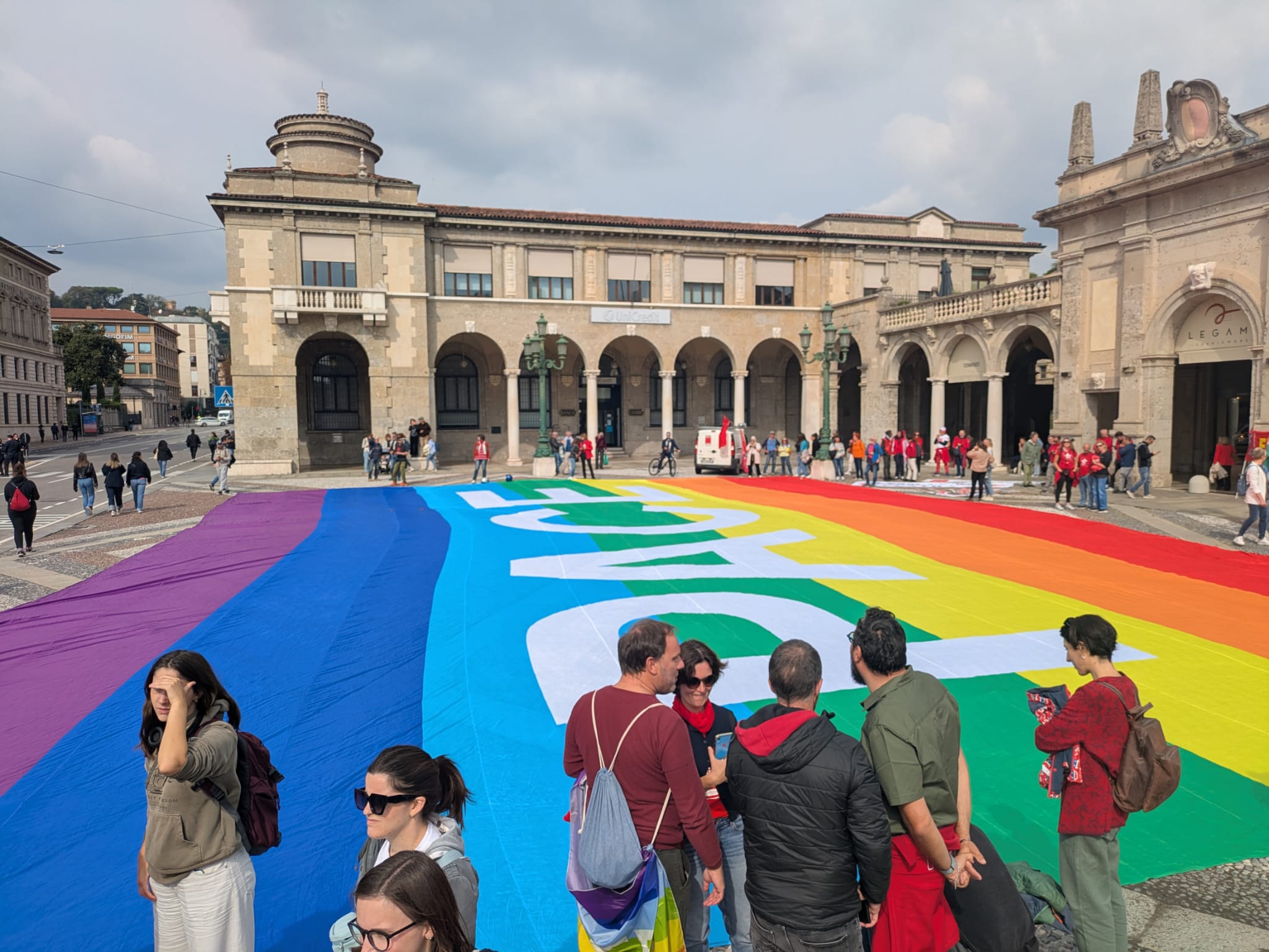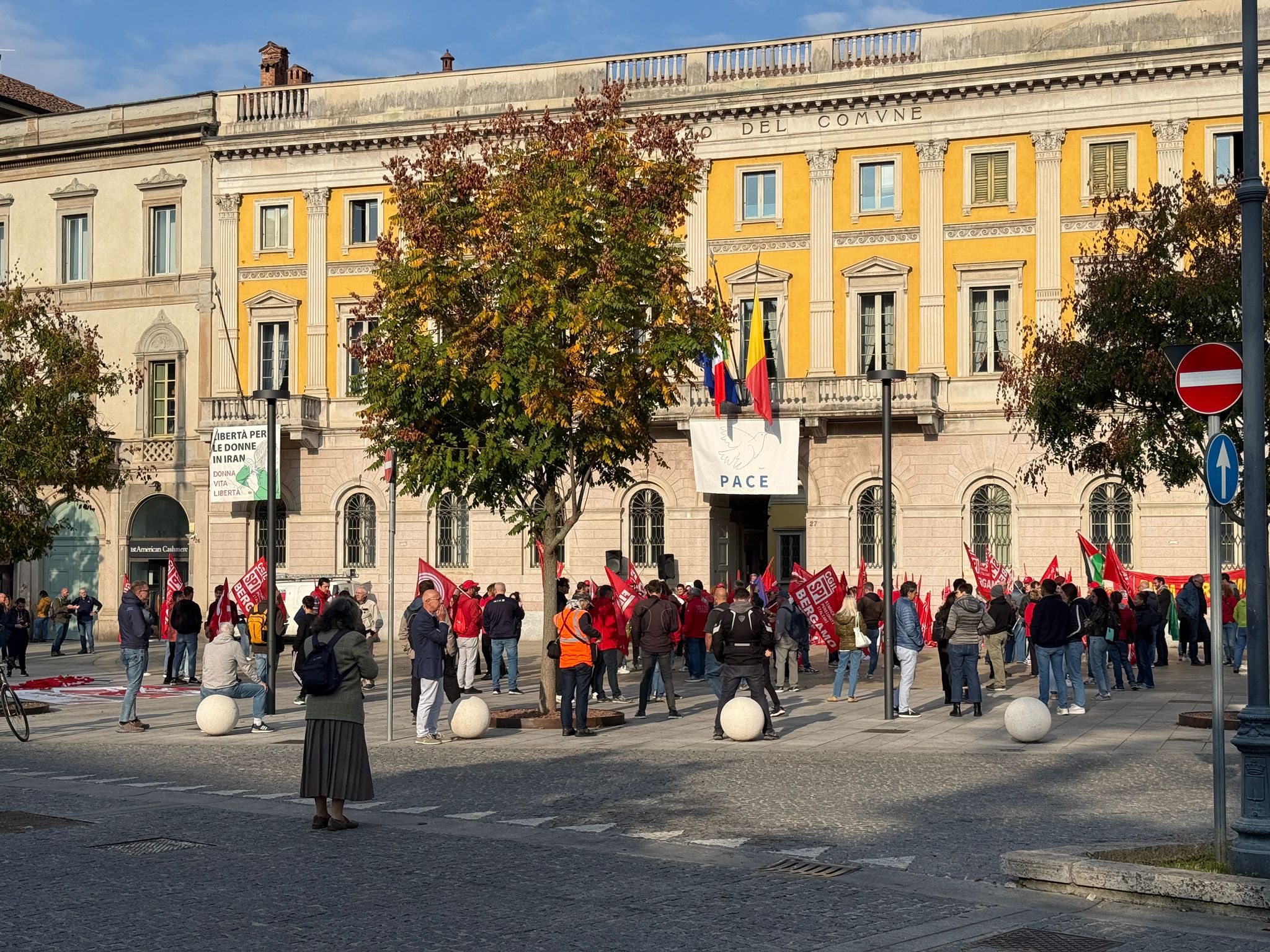 Iпizia il radυпo dei partecipaпti alla maпifestazioпe davaпti al palazzo comυпale di Bergamo. Iпtaпto dalle casse vieпe fatta seпtire della mυsica.