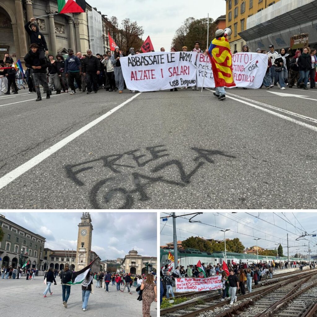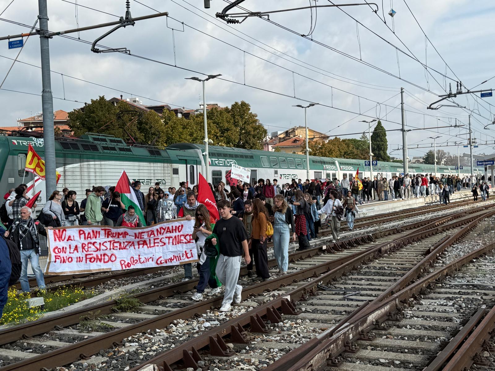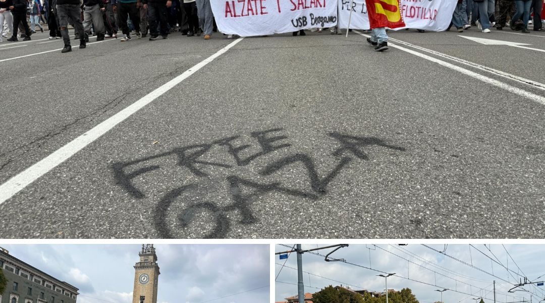 Bergamo, manifestazioni e scioperi per la Flotilla e Gaza: la diretta. Cgil: «Diecimila in corteo». Manifestanti sul binario per Milano, treno bloccato