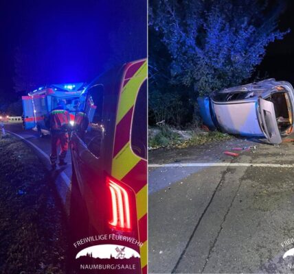 Der Pkw schoss über den linken Fahrbahnrand hinaus und prallte mit voller Wucht gegen einen Baumstumpf, der sich etwa vier Meter von der Straße entfernt befand. Durch die Wucht des Aufpralls kippte das Auto nach links, rutschte über eine Böschung und blieb nach etwa acht Metern auf dem Dach liegen.