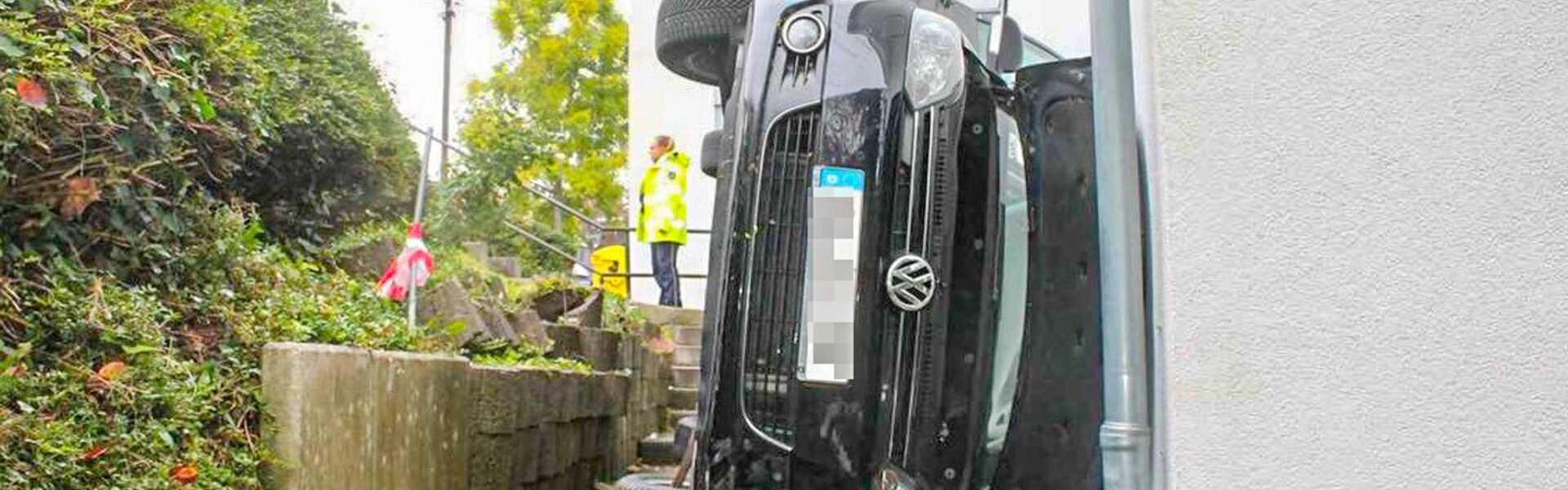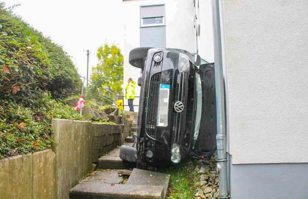 Beim Abbiegen kam er aufgrund eines Fahrfehlers nach links von der Fahrbahn ab. Der Wagen durchbrach eine Hecke und stürzte anschließend eine Mauer hinunter. Der Golf kam auf der Fahrerseite unmittelbar im Hauseingang eines Wohnhauses zum Liegen.